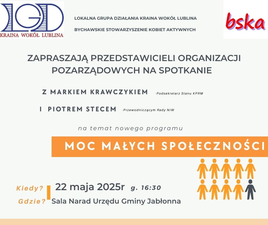 Lokalna Grupa Działania „Kraina wokół Lublina” oraz Bychawskie Stowarzyszenie Kobiet Aktywnych zapraszają przedstawicieli organizacji pozarządowych na spotkanie informacyjne poświęcone nowemu programowi „Moc Małych Społeczności”, w ramach którego rozpoczął się nabór wniosków.
