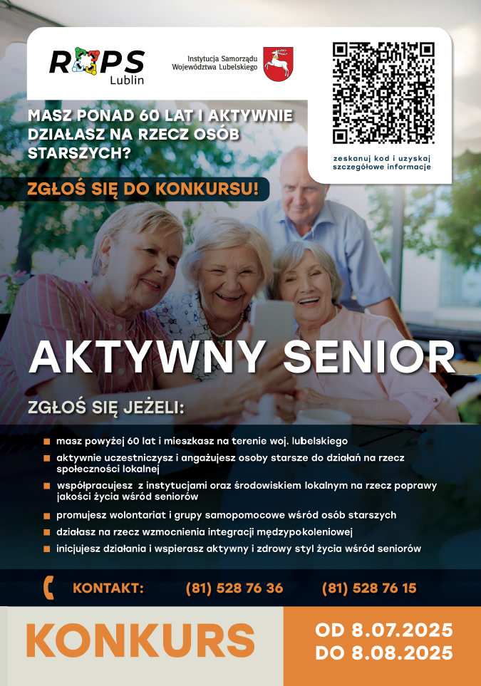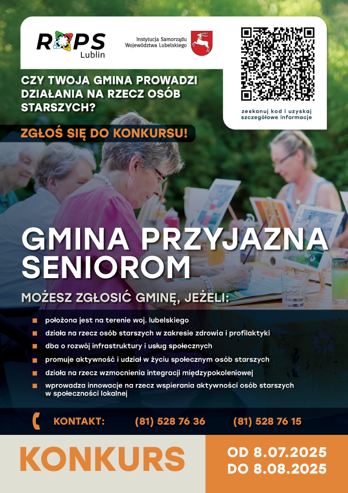 Szczegółowe informacje wraz z Regulaminami konkursów oraz formularzami zgłoszeniowymi znajdą Państwo pod poniższym linkiem: https://rops.lubelskie.pl/dyrektor-regionalnego-osrodka-polityki-spolecznej-w-lublinie-oglasza-konkursy-gmina-przyjazna-seniorom-i-aktywny-senior-4/
