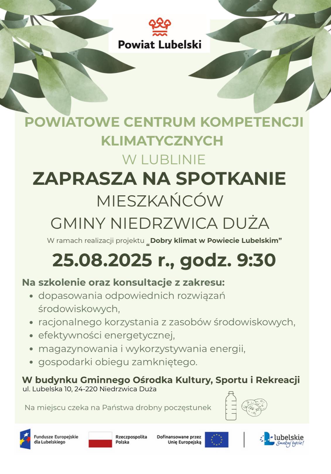Powiatowe Centrum Kompetencji Klimatycznych w Lublinie zaprasza na spotkanie w ramach realizacji projektu "Dobry klimat w Powiecie Lubelskim”.