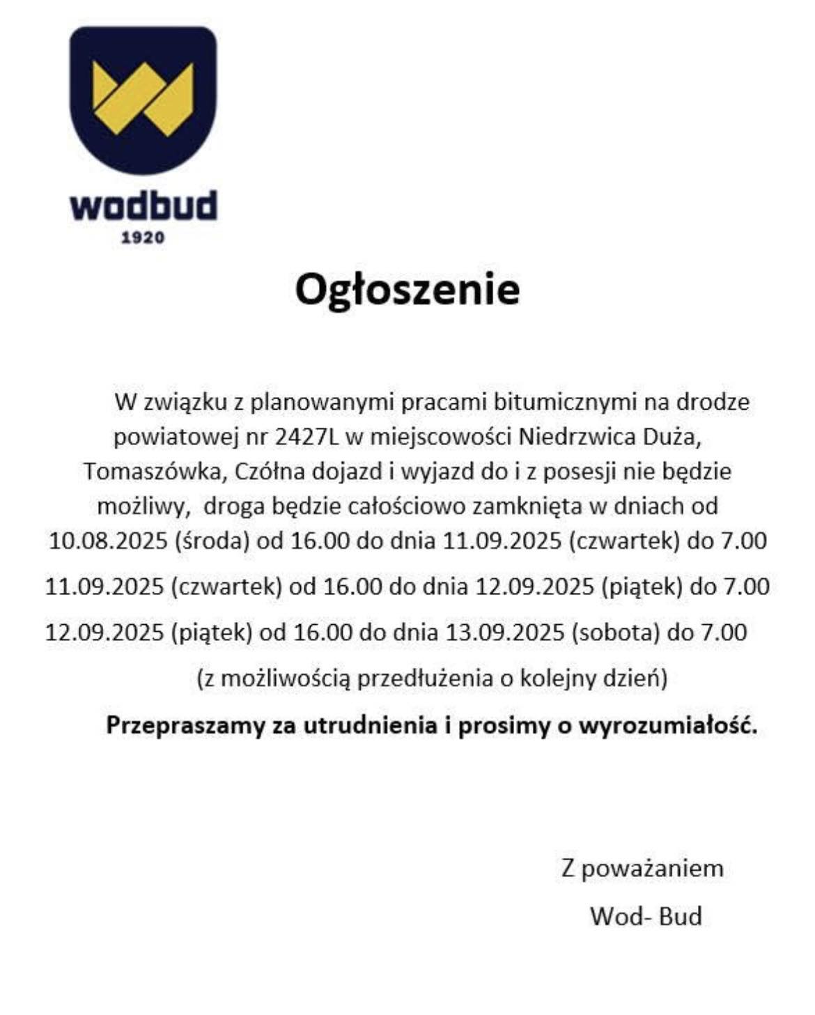 Informacja firmy WOD-BUD o częściowo zamkniętej drodze na trasie Niedrzwica Duża - Bełżyce