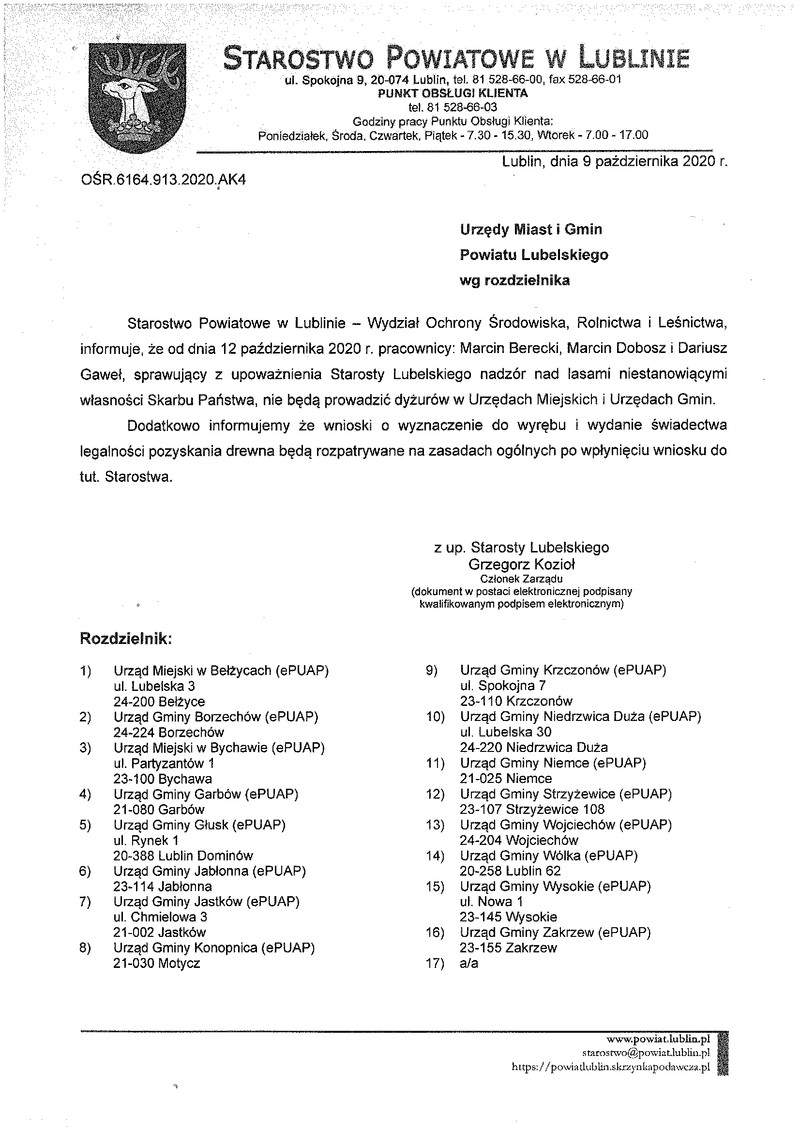 Informacja Starostwa Powiatowego w Lublinie dotycząca pracy inspektorów sprawujących nadzór nad lasami niestanowiącymi własności Skarbu Państwa.