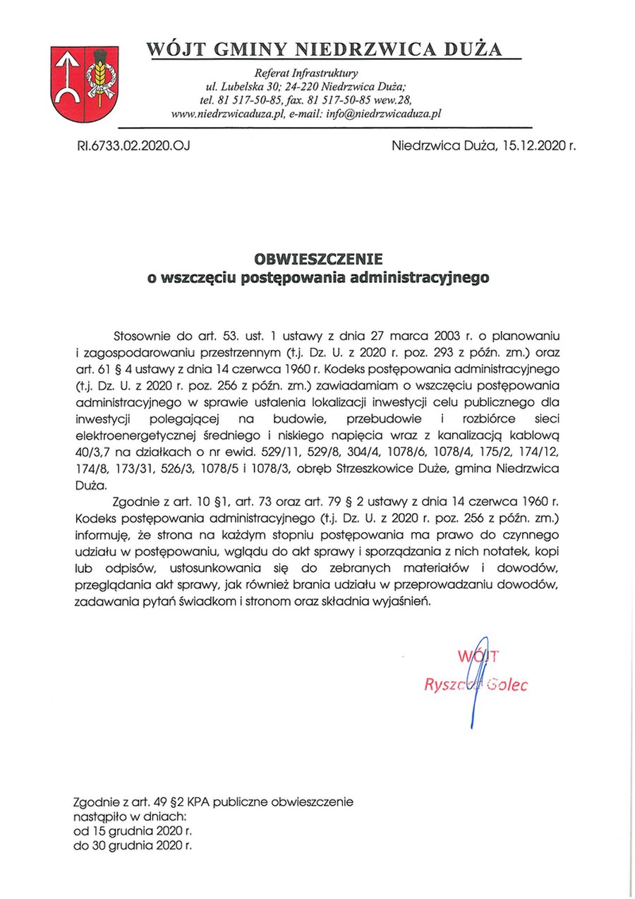 Obwieszczenie Wójta Gminy Niedrzwica Duża - 15.12.2020 r.