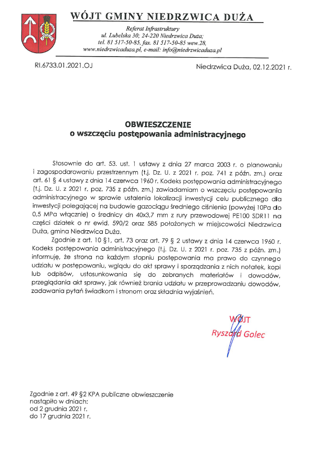 Obwieszczenie Wójta Gminy Niedrzwica Duża z dnia 2 grudnia 2021 r. o wszczęciu postępowania administracyjnego w sprawie ustalenia lokalizacji inwestycji celu publicznego dla inwestycji polegającej na budowie gazociągu średniego ciśnienia (powyżej 10Pa do 0,5 MPa włącznie) o średnicy dn 40x3,7 mm z rury przewodowej PE100 SDR11 na części działek o nr ewid. 590/2 oraz 585 położonych w miejscowości Niedrzwica Duża, gmina Niedrzwica Duża.