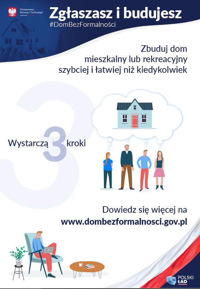 Ministerstwo Rozwoju i Technologii przygotowało rozwiązanie, które ułatwia budowę domów. Program #DomBezFormalności wszedł w życie z początkiem stycznia 2022 r. Wprowadza znaczące ułatwienia w budowie domów do 70 m kw. powierzchni zabudowy. Dzięki Programowi każdy, kto ma działkę budowlaną, może wybudować na niej – w uproszczonej procedurze – dom do 70 m kw. powierzchni zabudowy w celach mieszkaniowych lub rekreacyjnych. W przypadku braku planu zagospodarowania przestrzennego warunki zabudowy wydawane są w 21 dni, a budowę można rozpocząć bezpośrednio po zgłoszeniu.