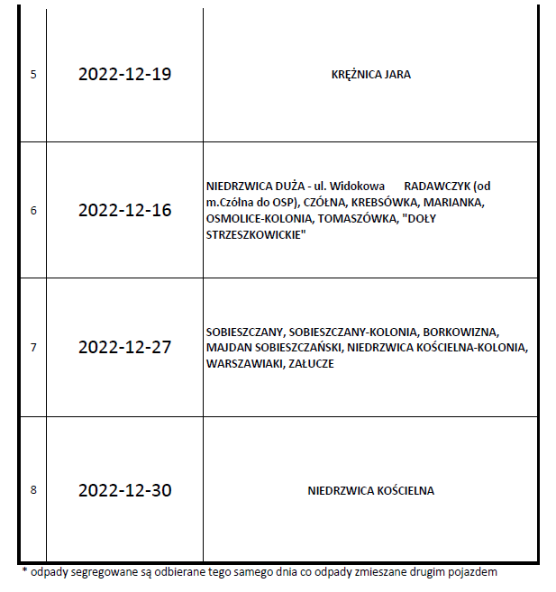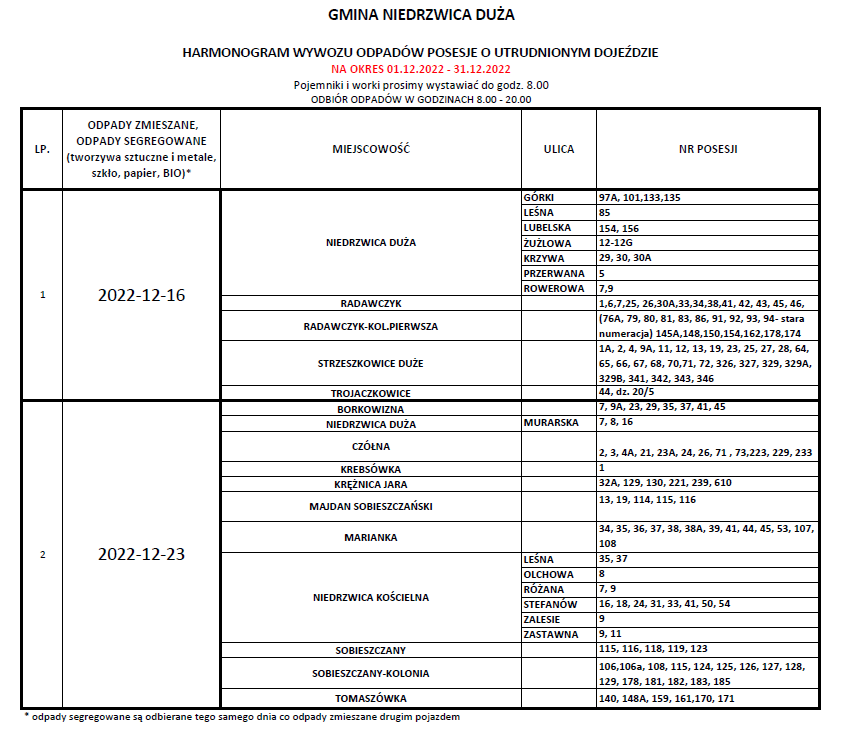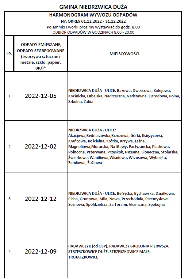 Harmonogram odbioru odpadów komunalnych oraz odpadów zbieranych selektywnie z terenu Gminy Niedrzwica Duża na okres 01.12.2022 - 31.12.2022 r.Archiwum