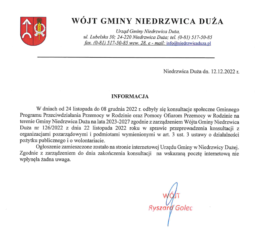 INFORMACJA DOT. UWAG ODNOŚNIE KONSULTACJI SPOŁECZNYCH W SPRAWIE UCHWALENIA GMINNEGO PROGRAMU PRZECIWDZIAŁANIA PRZEMOCY W RODZINIE ORAZ POMOCY OFIAROM PRZEMOCY W RODZINIE NA TERENIE GMINY NIEDRZWICA DUŻA NA LATA 2023-2027