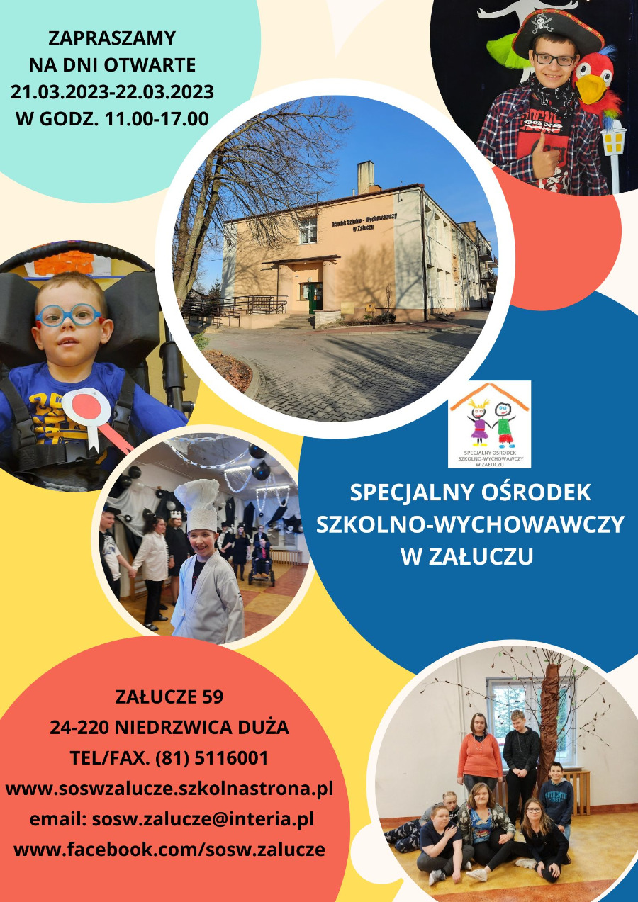 Serdecznie zapraszamy na Dni Otwarte w Specjalnym Ośrodku Szkolno-Wychowawczym w Załuczu, które odbędą się w dniach 21- 22 marca 2023 roku w godzinach: 11.00 - 17.00.
