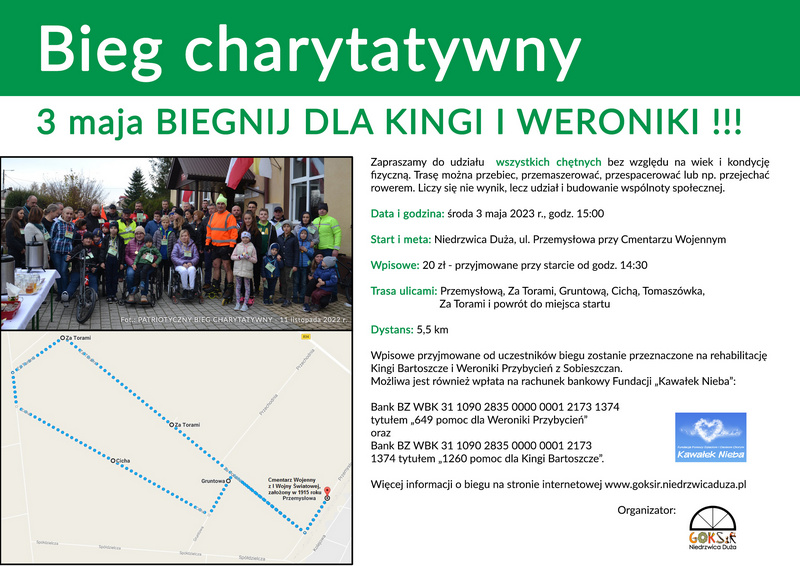 Gminny Ośrodek Kultury, Sportu i Rekreacji w Niedrzwicy Dużej (GOKSiR) zaprasza do udziału w Biegu Charytatywnym dla Kingi Bartoszcze i Weroniki Przybycień. Bieg odbędzie się 3 maja 2023 r., start o godz. 15.00 spod Cmentarza Wojennego z I Wojny Światowej przy ul. Przemysłowej w Niedrzwicy Dużej. Pobiegniemy trasą o dystansie 5,5 km ulicami: Przemysłową, Za Torami, Gruntową, Cichą, Tomaszówka, Za Torami i powrót do miejsca startu.