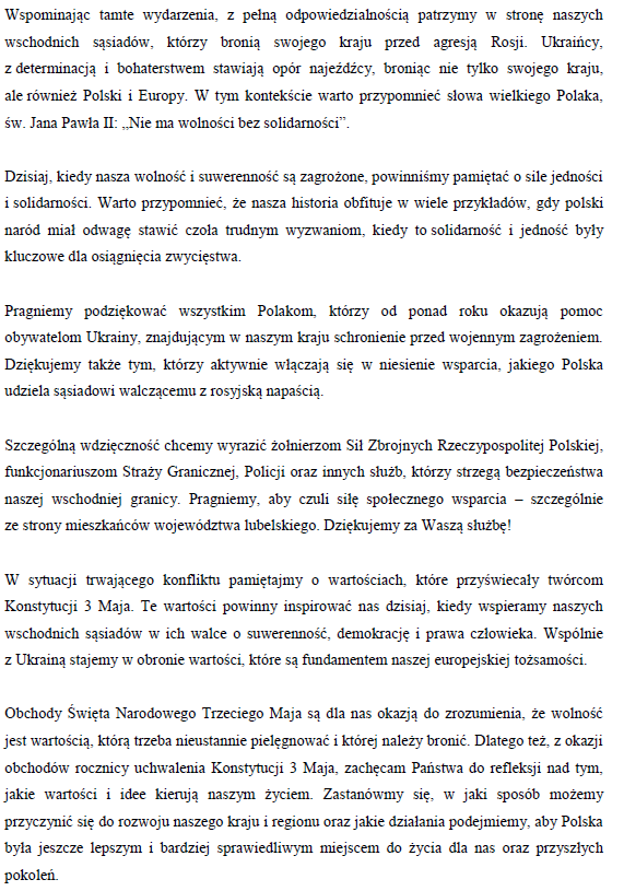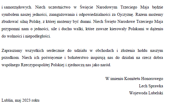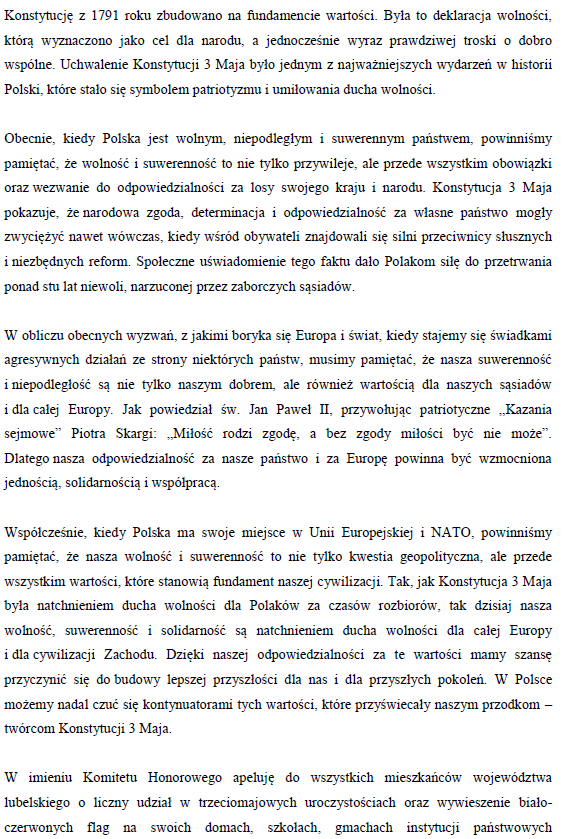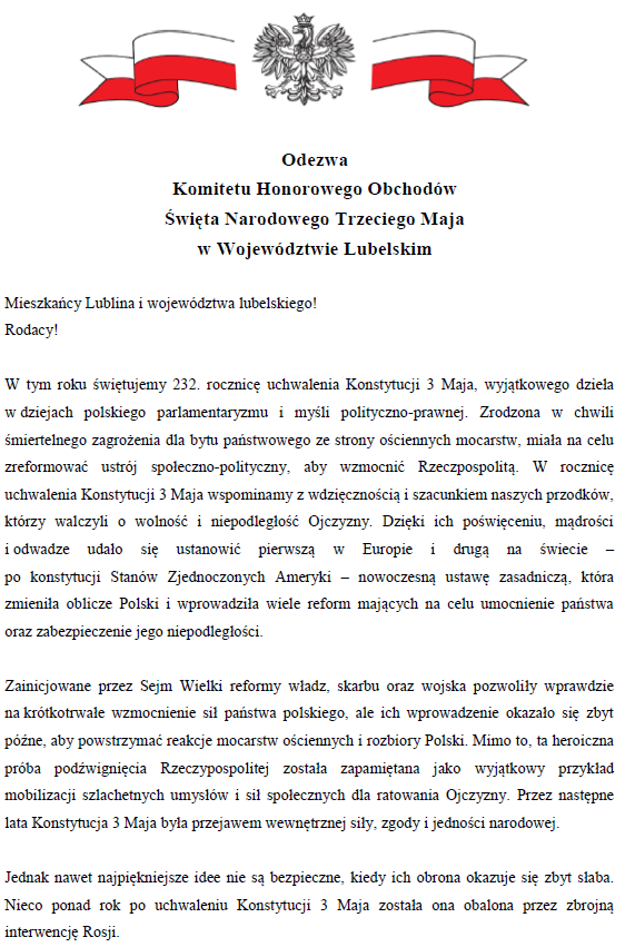 Odezwa Komitetu Honorowego Obchodów Święta Narodowego Trzeciego Maja w Województwie LubelskimArchiwum