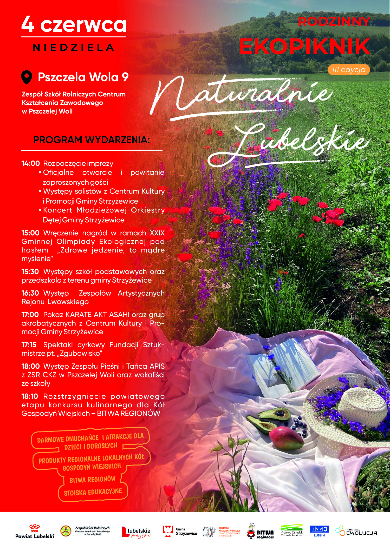 Powiat Lubelski – Biuro ds. Informacji i Promocji, we współpracy z Urzędem Marszałkowskim Województwa Lubelskiego, Centrum Kultury i Promocji Gminy Strzyżewice oraz Zespołem Szkół Rolniczych Centrum Kształcenia Zawodowego w Pszczelej Woli, organizuje III edycję Rodzinnego Ekopikniku „Naturalnie Lubelskie”, który odbędzie się w dniu 4 czerwca br. na terenie Zespołu Szkół Rolniczych Centrum Kształcenia Zawodowego w Pszczelej Woli.