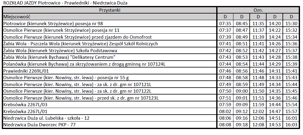 Informujemy, że na wniosek Gminy Niedrzwica Duża i Gminy Strzyżewice w dniu 1 czerwca 2023 r. zostanie uruchomiona komunikacja publiczna linii nr 16: Niedrzwica Duża – Prawiedniki – Piotrowice. Organizatorem komunikacji jest Starostwo Powiatowe w Lublinie, a operatorem: firma „Pasażer” Mariusz Igras z siedzibą w Bychawie. Poniżej przedstawiamy rozkłady jazdy: