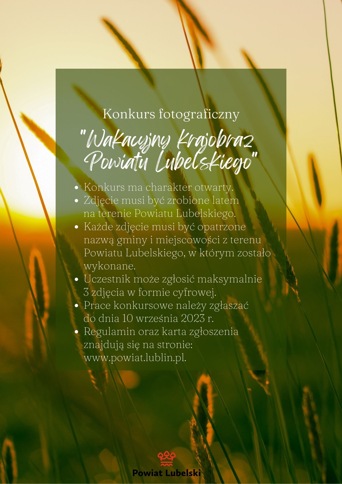 Zapraszamy do udziału w konkursie fotograficznym "Wakacyjny krajobraz Powiatu Lubelskiego"! Regulamin konkursu oraz karta zgłoszeniowa są dostępne w załącznikach poniżej.