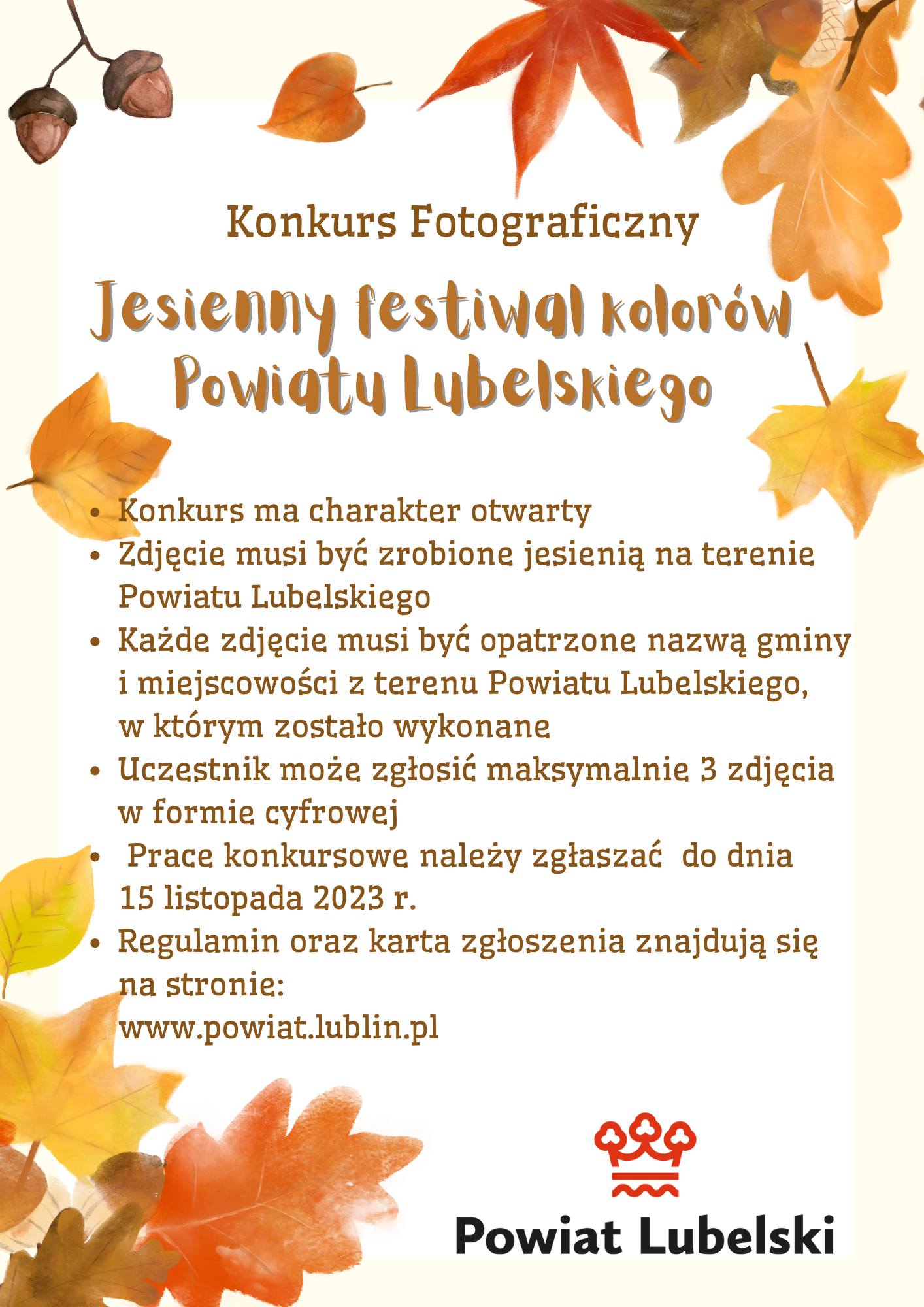 Starostwo Powiatowe w Lublinie organizuje konkurs fotograficzny "Jesienny festiwal kolorów Powiatu Lubelskiego”. Konkurs skierowany jest do wszystkich mieszkańców gmin Powiatu Lubelskiego.
