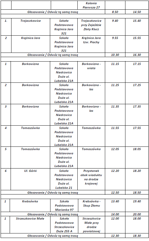 Wójt Gminy Niedrzwica Duża informuje, że w dniu wyborów do Sejmu i Senatu RP zarządzonych na dzień 15 października 2023 r. będzie można skorzystać z bezpłatnego przewozu pasażerskiego. Poniżej udostępniamy rozkład jazdy: