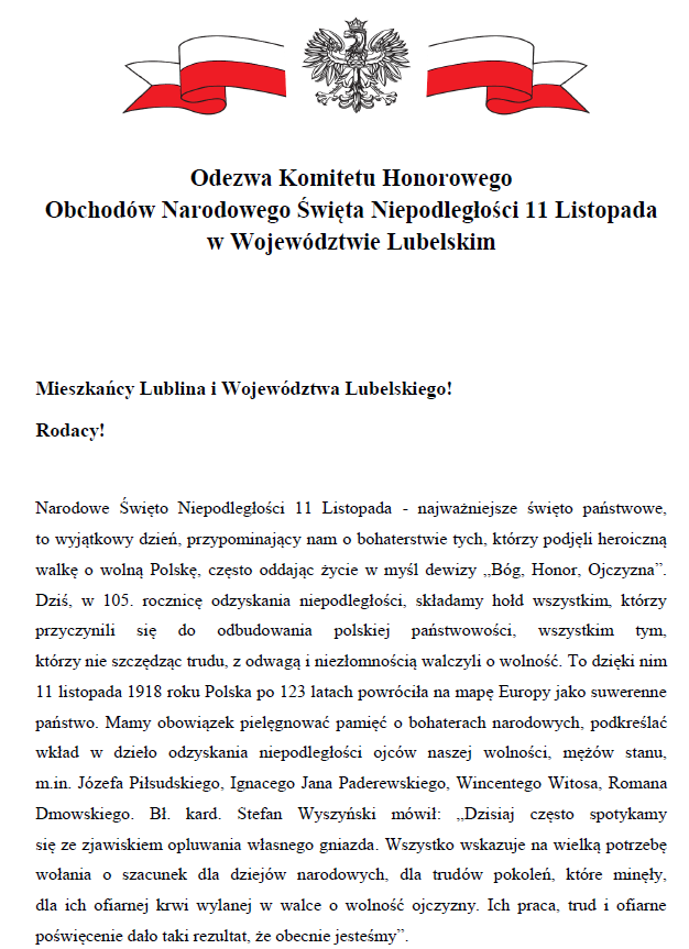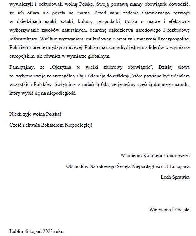 Odezwa Komitetu Honorowego Obchodów Święta Niepodległości 11 listopada 2023Archiwum