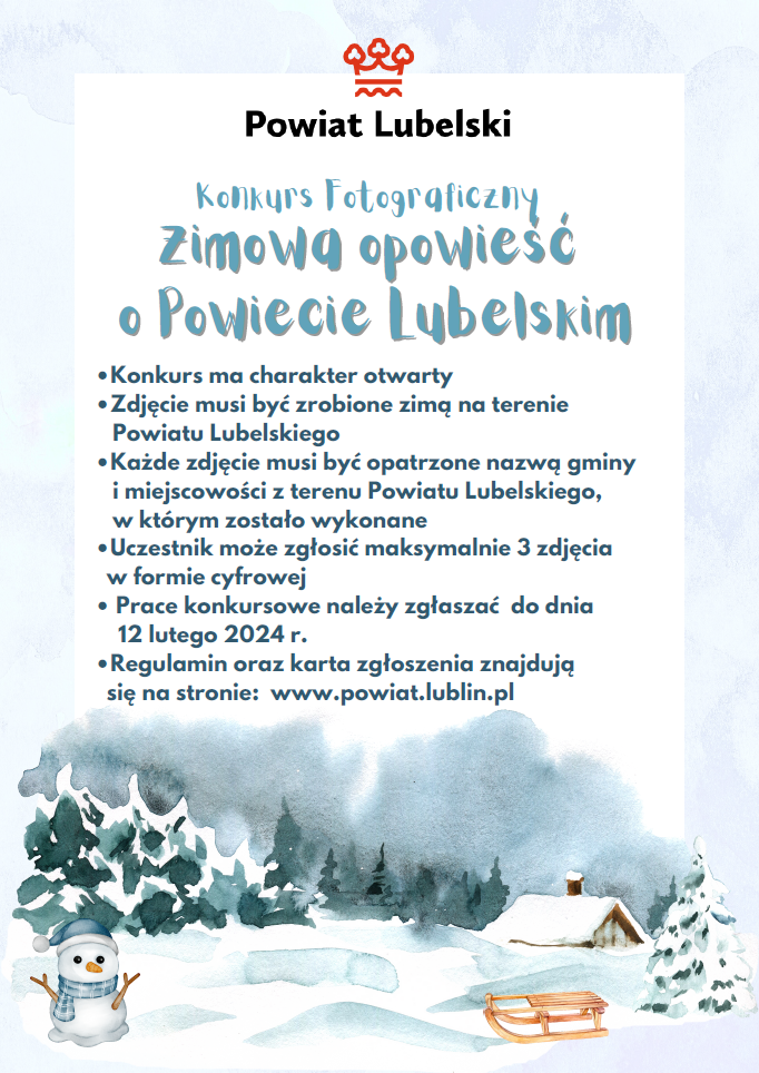Starostwo Powiatowe w Lublinie zaprasza do udziału w konkursie fotograficznym „Zimowa opowieść o Powiecie Lubelskim”.