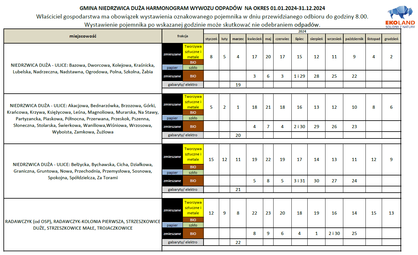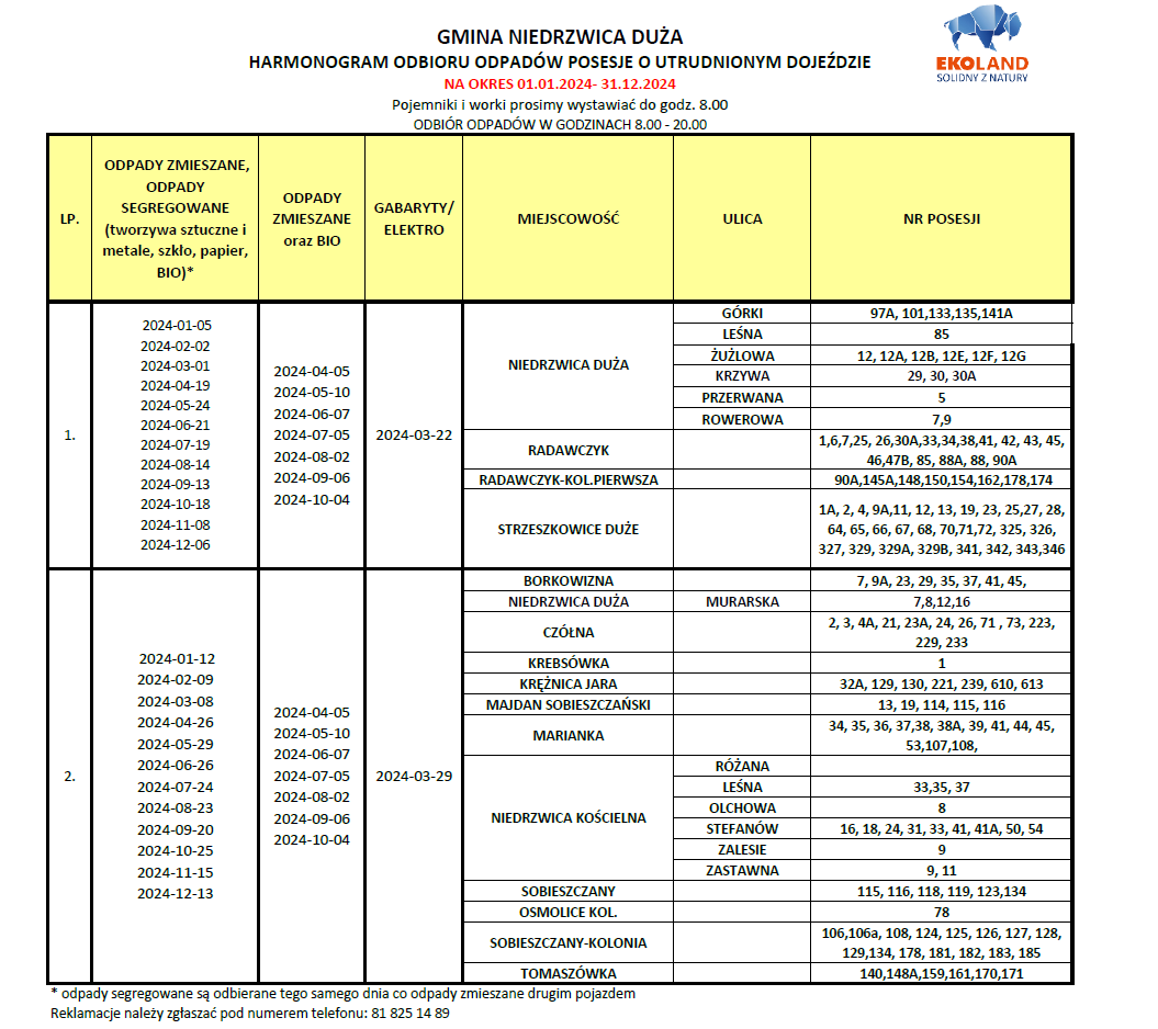 Harmonogram wywozu odpadów z posesji o utrudnionym dojeździe - pdf