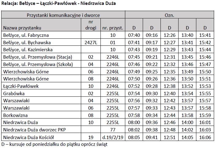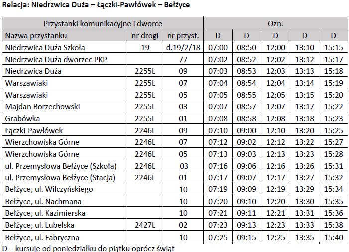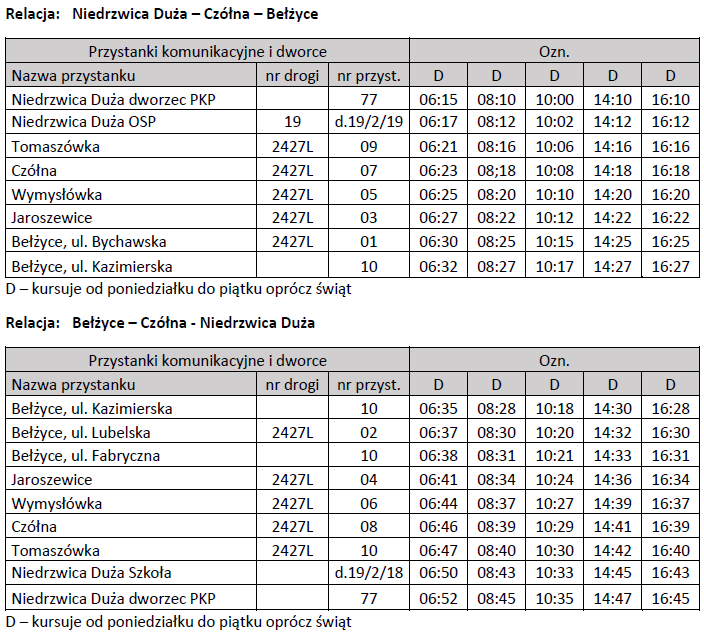 Poniżej przedstawiamy aktualny rozkład jazdy na trasie Niedrzwica Duża – Czółna – Bełżyce oraz Niedrzwica Duża – Łączki-Pawłówek – Bełżyce.