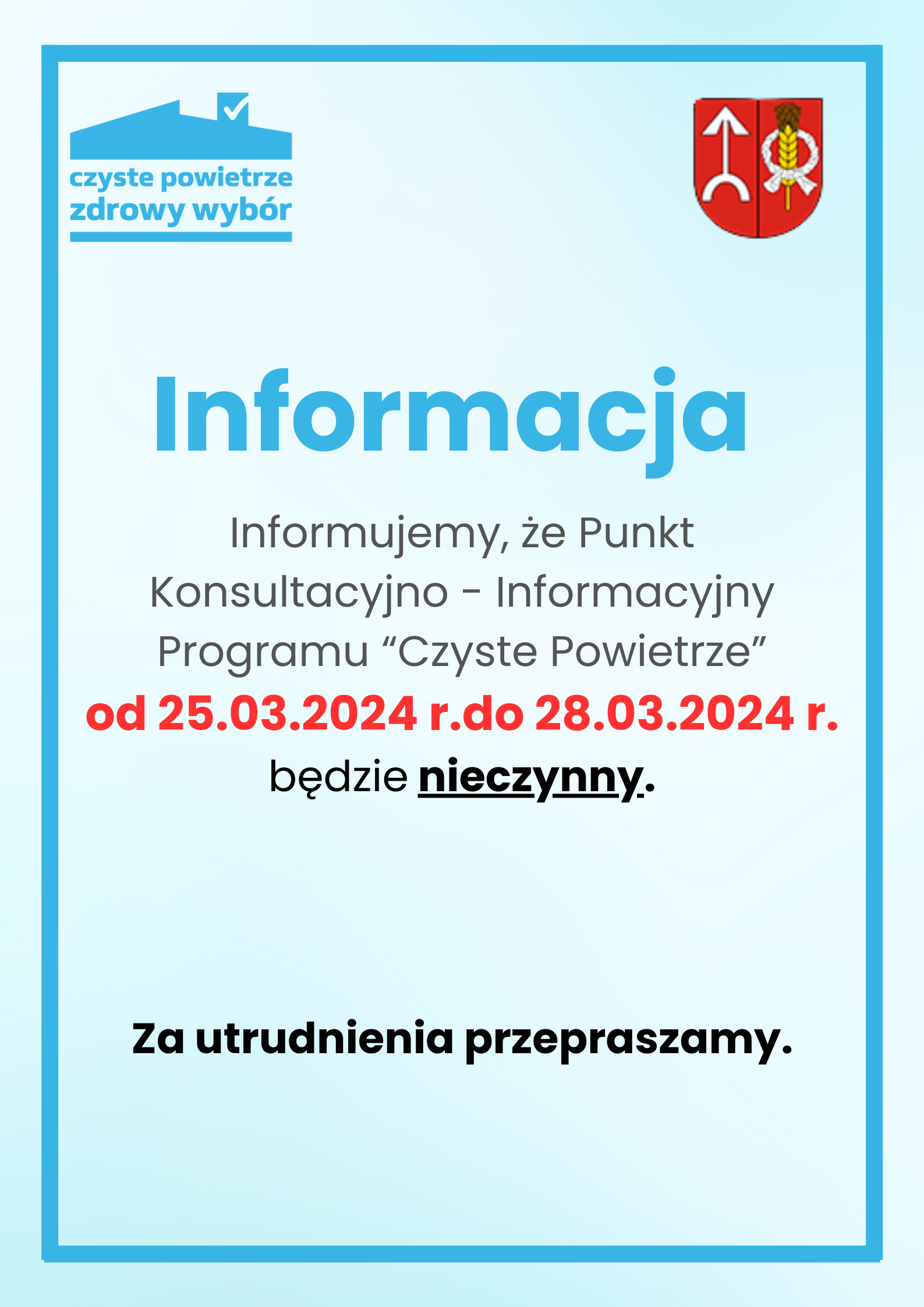 Informacja o nieczynnym Punkcie Konsultacyjno-Informacyjnym Programu "Czyste Powietrze"