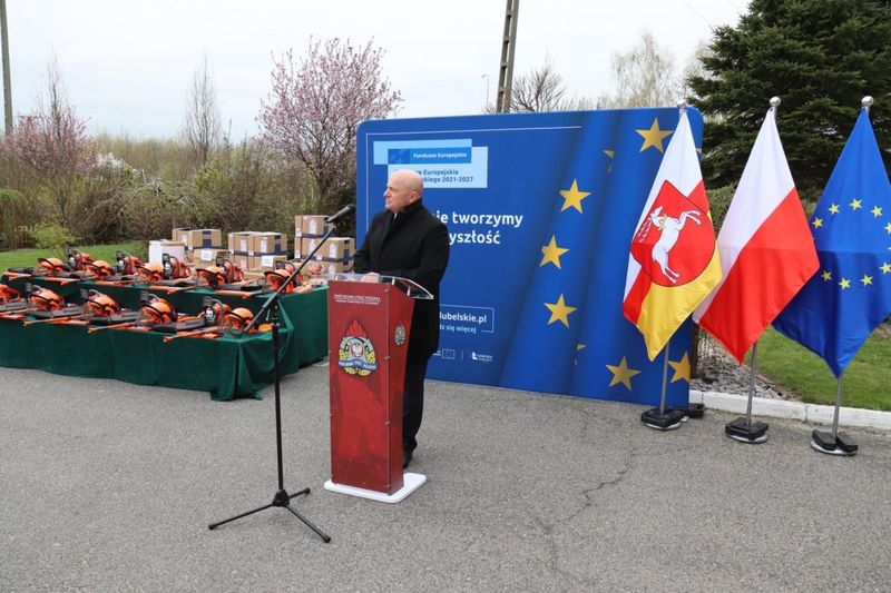 Wyposażenie sfinansowano ze środków Fundusze Europejskie dla Lubelskiego 2021 - 2027 w ramach projektu: „Dostosowanie Krajowego Systemu Ratowniczo-Gaśniczego na terenie województwa lubelskiego do zmian klimatycznych, zmian w środowisku naturalnym oraz zagrożeń cywilizacyjnych”, Priorytet Środowiskowy - Ochrona zasobów środowiska i klimatu.