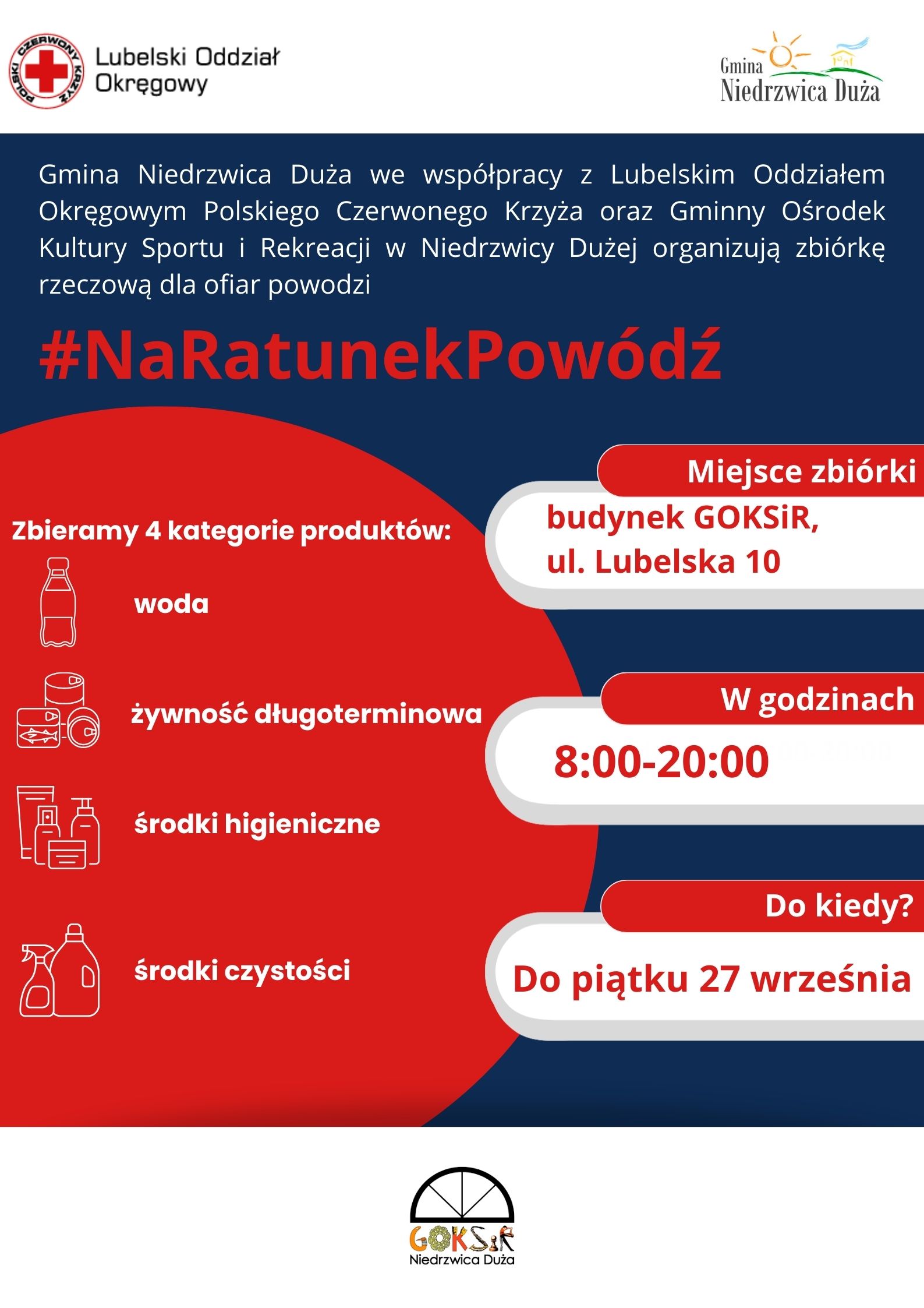 Informujemy, że został wydłużony termin zbiórki rzeczowej dla ofiar powodzi. Niezbędne produkty można dostarczać do budynku GOKSiR do dnia 27 września 2024 roku. #NaRatunekPowódź
